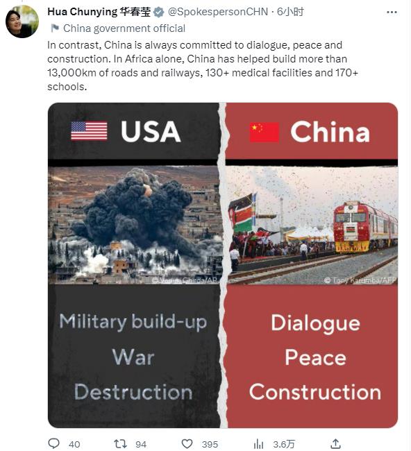 華春瑩接著在第二條推文中發了一張中美對比圖,圖中顯示美國沉迷于軍事建設、戰爭和破壞?!跋啾戎?,中國始終堅持對話、和平、建設。僅在非洲,中國就援建了1.3萬多公里公路和鐵路、130多個醫療設施、170多所學校。”華春瑩說。