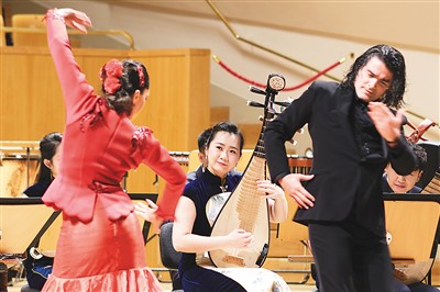音樂(lè)會(huì)在一曲熱烈歡快的《春節(jié)序曲》中拉開(kāi)序幕。兩國(guó)樂(lè)團(tuán)合奏的新創(chuàng)曲目《陽(yáng)光永遠(yuǎn)照耀著我們的友誼》融合了中西音樂(lè)特色,令觀眾耳目一新;京劇《貴妃醉酒》向西班牙觀眾展現(xiàn)了中國(guó)傳統(tǒng)戲曲文化的獨(dú)特風(fēng)采;西班牙歌唱家用中文和西文演唱《我愛(ài)你中國(guó)》,以歌聲傳遞了兩國(guó)民眾間的友好情誼;中國(guó)樂(lè)器笙演奏的《西班牙斗牛曲》“混搭”西班牙“國(guó)粹”弗拉門(mén)戈舞蹈,更是令人擊節(jié)叫好。兩國(guó)藝術(shù)家以樂(lè)會(huì)友、以藝通心,通過(guò)中西音樂(lè)元素的碰撞與交融,展現(xiàn)了東西方文化的互融互鑒。
