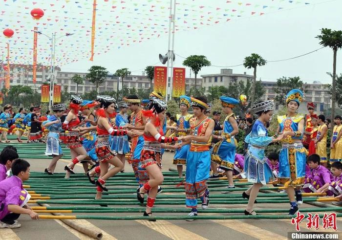 壯族民眾跳竹竿舞。林浩 攝