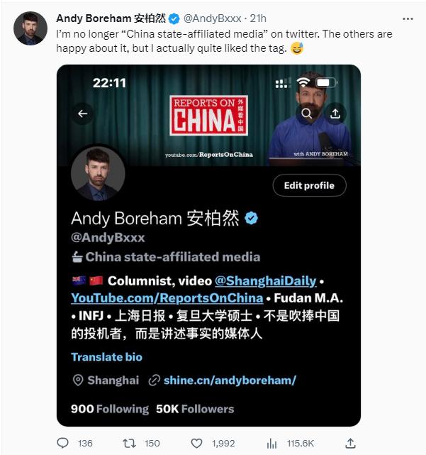 在上海工作生活了近10年的新西蘭媒體人安柏然寫道,“我不再是推特上的‘中國官方媒體’了。其他人對此很高興,但我其實很喜歡這個標簽。”