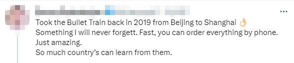 還有網(wǎng)友說,“2019年坐高鐵從北京到上海。一些事我永遠不會忘記。速度很快。太棒了。很多國家可以向他們學習。”