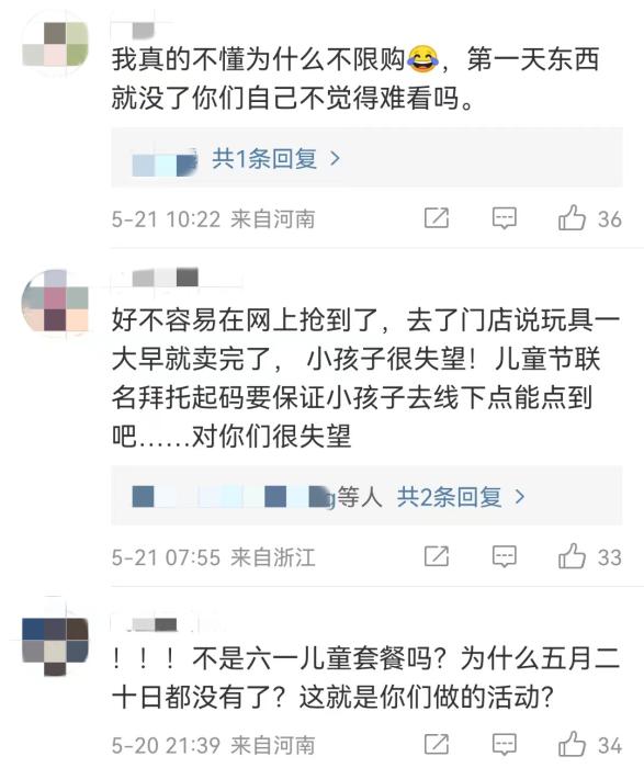 但自5月20日起,在社交平臺上,就不斷有人反映,已經買不到肯德基兒童節限定玩具。肯德基的官方微博下,也有很多人留言,門店已售罄,能不能補貨。