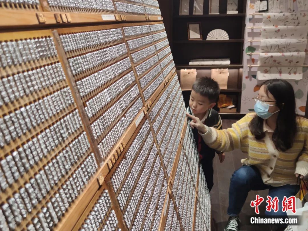 湖北武漢一書店內,一位母親給兒子講述中國古代四大發明之一印刷術的故事。李長林 攝
