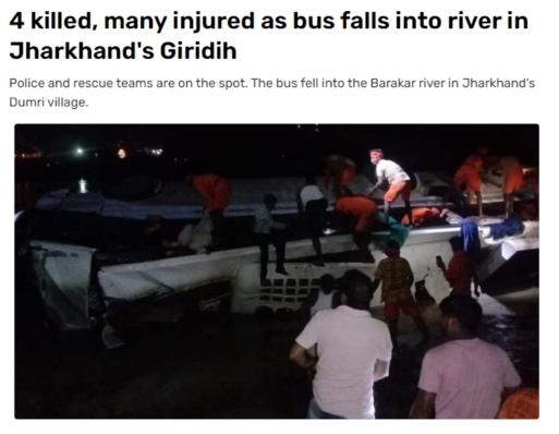 據報道,當地警方稱,當晚約20:40,在賈坎德邦(Jharkhand)的吉里迪(Giridih)縣,一輛從蘭契開往吉里迪的大巴車突然撞壞大橋欄桿,隨后墜入河流,橋梁高度約15米,造成至少4人死亡。預計還有幾人溺水身亡,救援行動正在進行中。