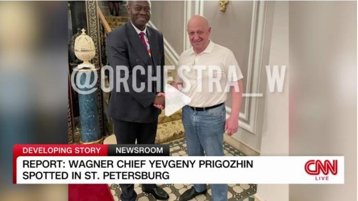 在圣彼得堡舉行的俄非峰會(huì)期間,“瓦格納”組織創(chuàng)始人普里戈任被拍到和與會(huì)非洲代表握手。(圖片來(lái)源:美國(guó)有線電視新聞網(wǎng)視頻截圖)