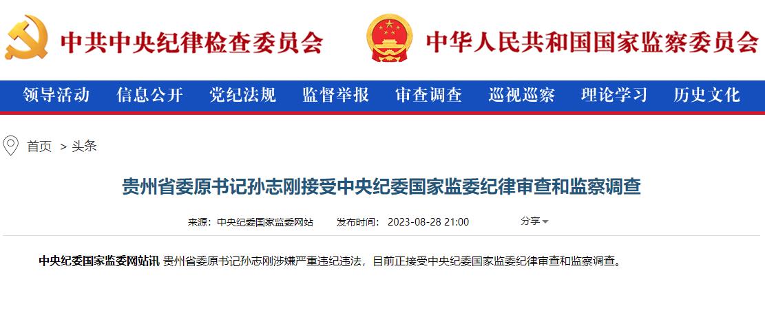 中新網(wǎng)北京8月29日電(記者 袁秀月)又見深夜打虎。中央紀委國家監(jiān)委網(wǎng)站28日晚通報,貴州省委原書記孫志剛涉嫌嚴重違紀違法,目前正接受中央紀委國家監(jiān)委紀律審查和監(jiān)察調(diào)查。