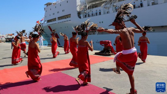 9月3日,中國海軍“和平方舟”號醫院船抵達東帝汶帝力港,當地民眾表演特色歌舞歡迎。新華社發(徐巍 攝)