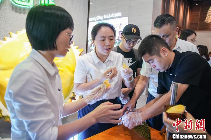 9月14日,廣西南寧消費者搶“鮮”品嘗產自馬來西亞“貓山王之鄉”——彭亨州勞勿縣的榴蓮。 中新社記者 陳冠言 攝