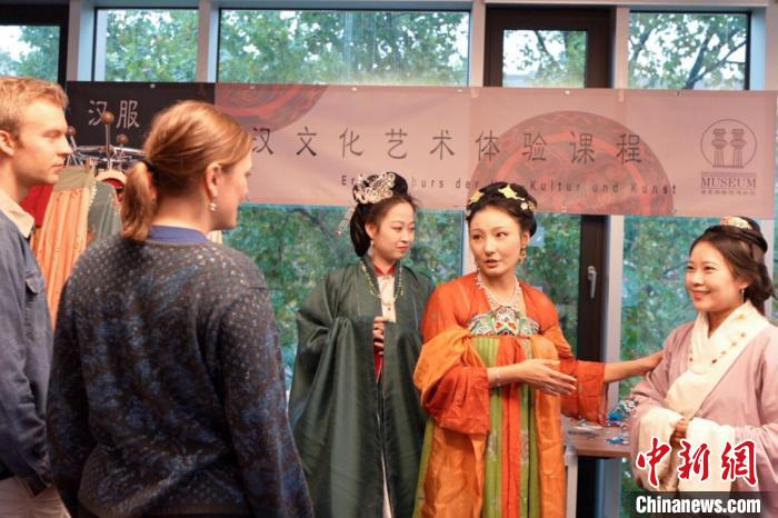 圖為活動講師為德國學生介紹漢制漢服特點。漢文化藝術交流中心供圖。