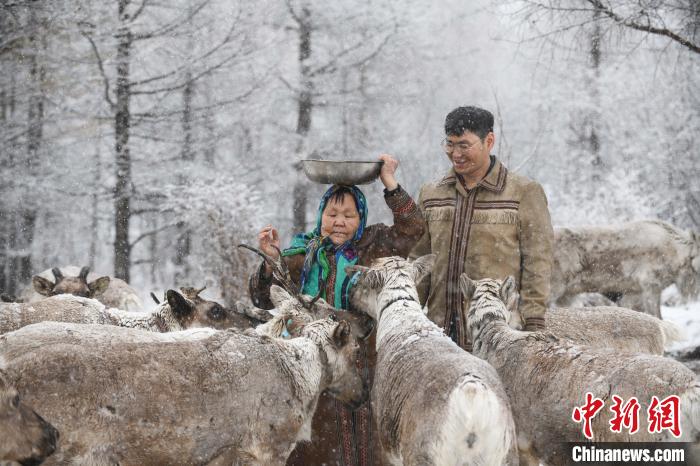 資料圖。圖為2023年4月29日,在內蒙古大興安嶺,柳霞與兒子雨果在雪中給馴鹿喂食豆餅?!⊥鮽?攝