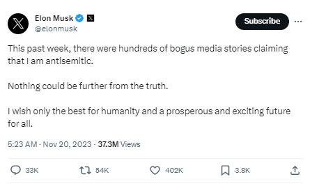 據報道,馬斯克在社交媒體平臺X上寫道,“過去一周,有數百個虛假的媒體報道聲稱我是反猶太主義者。事實并非如此。我只希望人類一切都好,所有人都有一個繁榮和令人興奮的未來。”