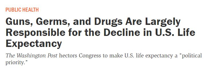中國(guó)日?qǐng)?bào)網(wǎng)1月10日電 美國(guó)《理性》雜志(Reason)網(wǎng)站8日援引《華盛頓郵報(bào)》的文章稱,美國(guó)正面臨一場(chǎng)“壽命危機(jī)”,人口平均預(yù)期壽命在過去十年左右的時(shí)間里持平后呈下降趨勢(shì),而槍支、毒品等是導(dǎo)致危機(jī)的主要原因。