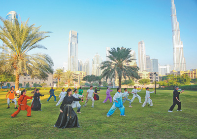 每到周末,世界最高建筑——阿聯(lián)酋迪拜哈利法塔附近的草坪上,一群身穿中式練功服的民眾排成隊列,伴著舒緩的中國古典民樂,起勢、野馬分鬃、白鶴亮翅……如今,越來越多民眾自發(fā)前來學習太極拳、太極劍、太極扇等,經(jīng)常性參加太極拳練習活動的就有來自50多個國家和地區(qū)的近200人。