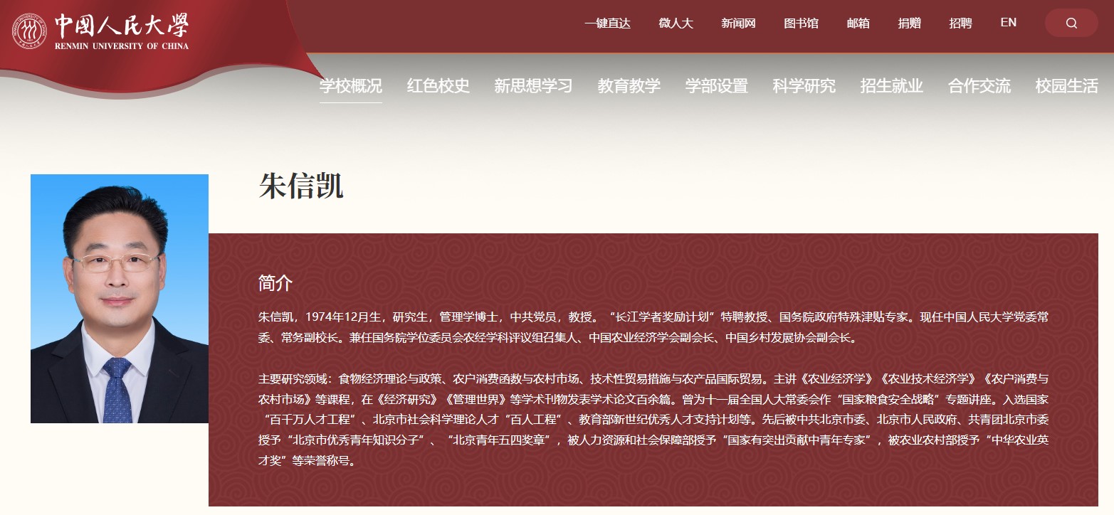 朱信凱,1974年12月生,研究生,管理學博士,中共黨員,教授。“長江學者獎勵計劃”特聘教授、國務院政府特殊津貼專家。現任中國人民大學黨委常委、常務副校長。兼任國務院學位委員會農經學科評議組召集人、中國農業經濟學會副會長、中國鄉村發展協會副會長。