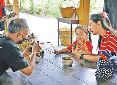 在曼谷桑普蘭濱江園有機農(nóng)場內(nèi),游客體驗泰國傳統(tǒng)泥塑手工藝。