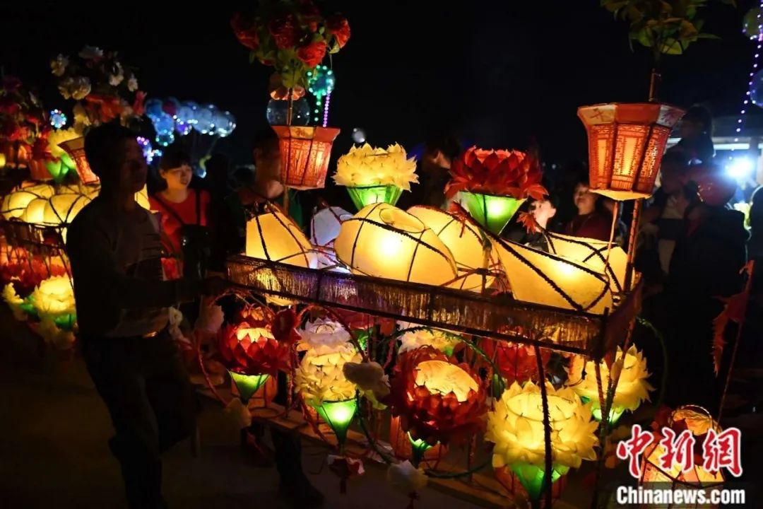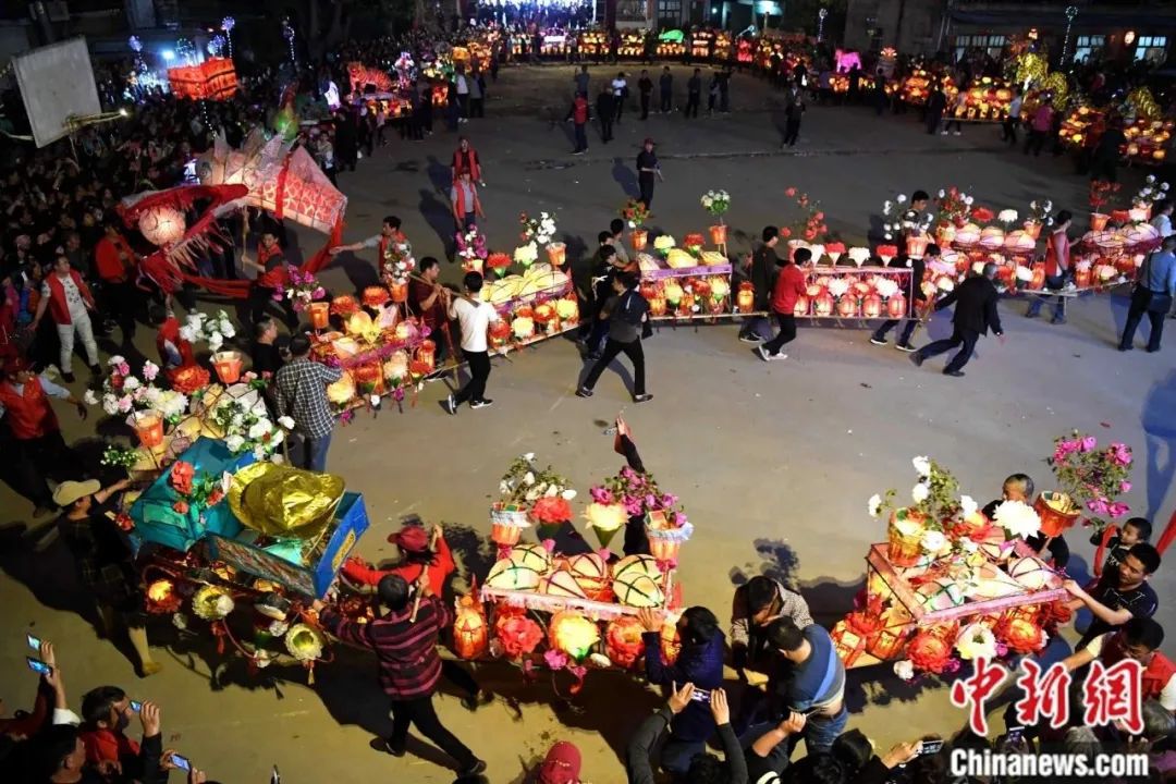 “客家祖地”福建省連城縣芷溪村舉行游花燈活動,吸引民眾體驗民俗文化。圖為游花燈現場。中新社記者 張斌 攝