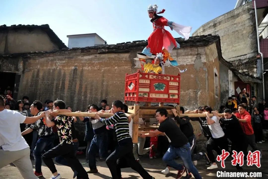 每年正月初十及正月二十六,潭頭鎮厚福村都會舉行傳統游神民俗活動,至今已有400多年的歷史。圖為傳統游神民俗活動中的巡游隊伍簇擁著挺神將的人走街串巷。中新社記者 呂明 攝