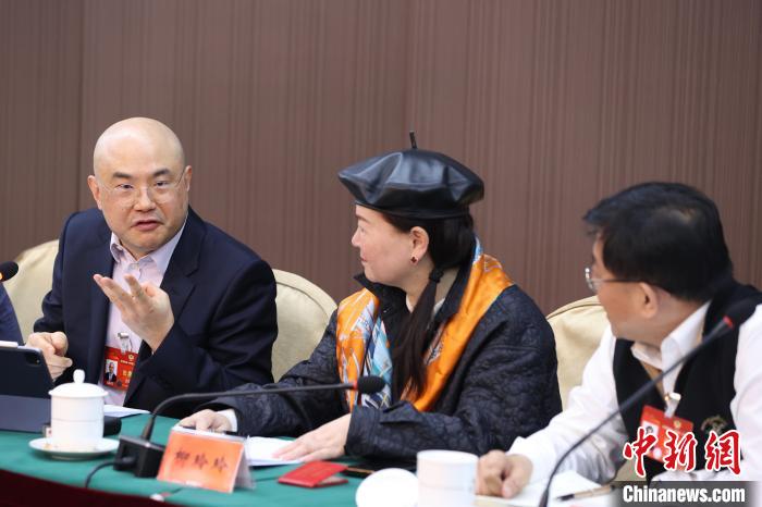 3月5日,全國政協十四屆二次會議僑聯界小組會議在北京舉行。圖為全國政協委員柳玲玲(中)和全國政協委員洪明基(左)。中新社記者 蔣啟明 攝