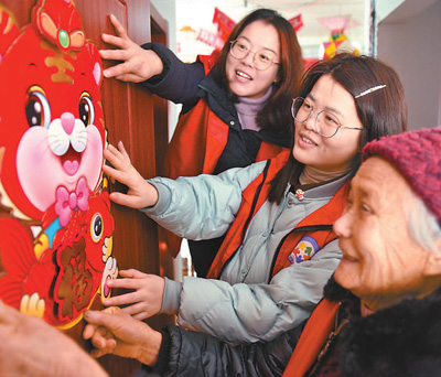 近日,安徽省當涂縣五彩社會工作服務中心的志愿者與空巢老人一起貼年畫,為老人家增添節日喜慶氣氛。