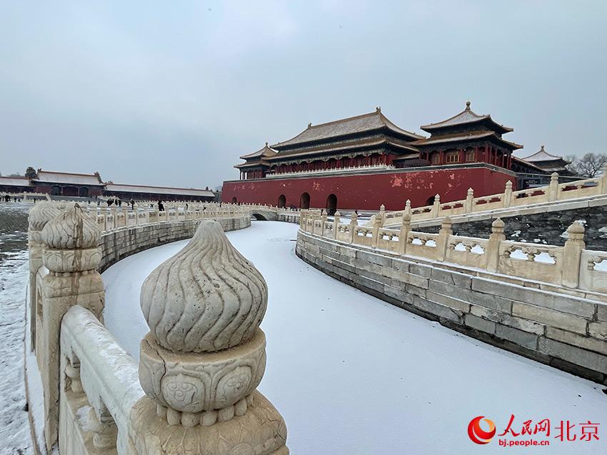 人民網北京1月20日電 (尹星云)今天是大寒節氣,北京迎來2022年第一場雪,故宮被白雪覆蓋,更顯出古建筑的魅力,引得眾多游客前來拍照游玩。