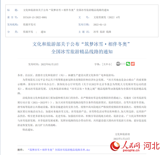 人民網(wǎng)石家莊1月19日電 (商帆)近日,文化和旅游部發(fā)布了“筑夢冰雪·相伴冬奧”全國冰雪旅游精品線路,10條線路涵蓋北京、河北、黑龍江、吉林、遼寧、新疆、內(nèi)蒙古7個北方冰雪旅游大省(區(qū)、市),以及甘肅、四川、湖北、重慶等近幾年冰雪旅游加快發(fā)展的地區(qū)。河北省“冰雪京張·冬奧之城”精品線路和“長城內(nèi)外·冰雪絲帶”精品線路入選。