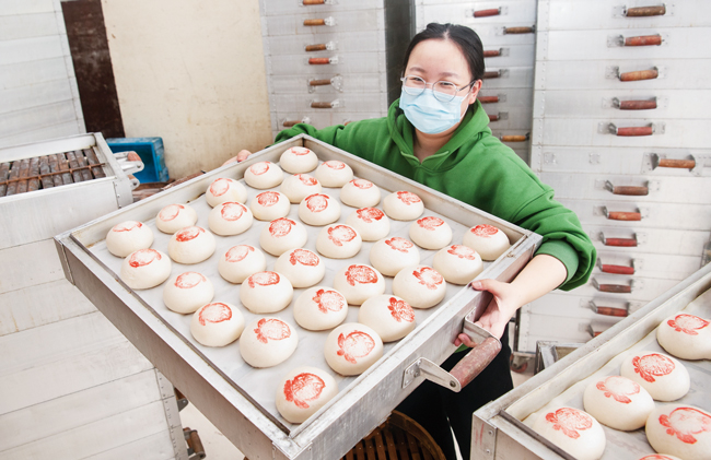 1月23日,金華市金東區(qū)赤松鎮(zhèn)仙橋饅頭店里熱氣騰騰,員工給剛蒸好的饅頭上蓋上紅印,寓意著新年“團(tuán)團(tuán)圓圓、蒸蒸日上”。隨著新春佳節(jié)臨近,赤松鎮(zhèn)仙橋各家饅頭店迎來了節(jié)前銷售高峰,饅頭夾扣肉、夾臭豆腐被稱作“金華漢堡”,成為春節(jié)餐桌上一道地方特色餐點(diǎn)。益泰饅頭店主人錢建濤表示,銷量主要集中在春節(jié)前一星期左右,晝夜不停一天要做5萬只以上。(時寬兵)