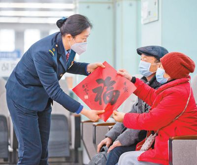 春運期間,南京火車站從細節著手、小事出發,推出了一系列溫馨服務。“158”雷鋒服務站購置一批適合兒童使用的口罩,教孩子們如何正確佩戴,同時為乘車旅客送上春聯、窗花或“福”字。圖為“158”雷鋒服務站客運值班員為旅客送上新春祝福。