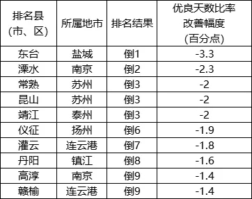 優良天數比率改善幅度相對較差的后10位(倒1-10名)依次是:東臺、溧水、常熟(昆山、靖江并列)、儀征、灌云、丹陽、高淳(贛榆并列)