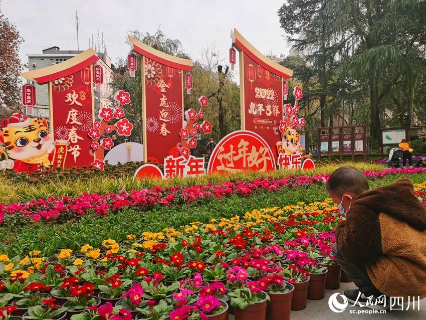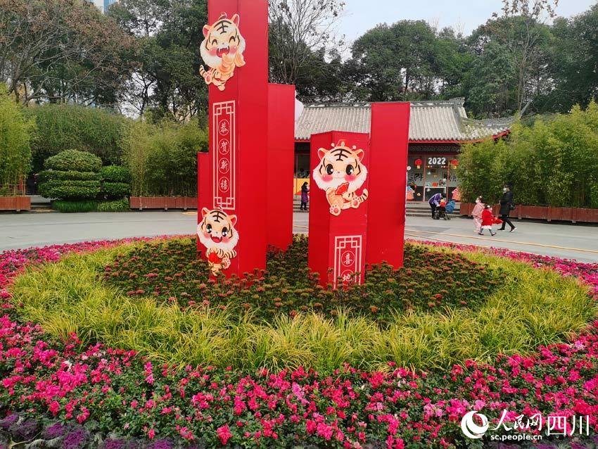 園內(nèi)的幾處空地上,布置了幾個(gè)花壇。上邊除了吉祥的紅黃色彩,還有可愛的動(dòng)漫形象老虎圖案。“虎年吉祥”“金虎迎春”“新年快樂過年好”……各種好彩頭的詞語(yǔ),標(biāo)示出歡度春節(jié)的主題,看了讓人精神為之一振。