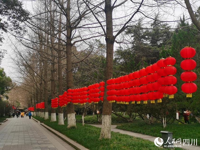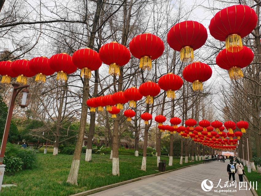 公園的大門布置成了喜慶的大紅色,門上門旁掛滿了紅燈籠。一串四個(gè)紅燈,既可以理解為“四季平安”,也可以理解為“四季發(fā)財(cái)”,還可以理解成“四平八穩(wěn)”……中國(guó)文化的詩(shī)意內(nèi)涵,可以激發(fā)出人們更多的想象力。