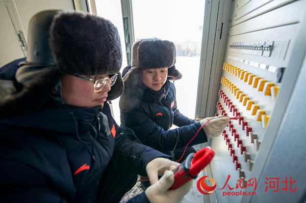 廊坊電力冬奧保障團隊李小虎(右)和同事在國家越野滑雪中心賽道上檢查高壓配電室。 鄒明攝