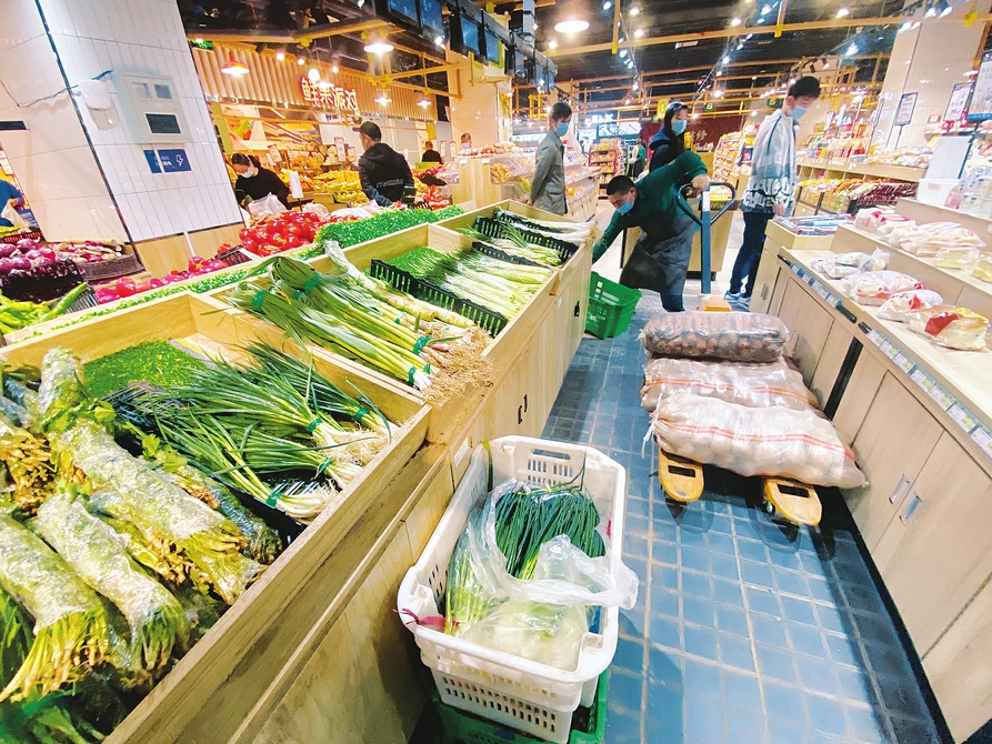 4月3日,太原市萬柏林區千峰南路一家超市內,工作人員為店內貨架補貨,以保障市民正常選購。 記者阮洋攝
