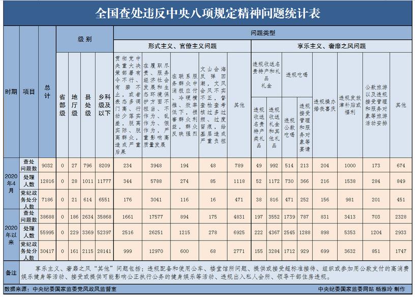 據介紹,為掌握全國貫徹落實中央八項規定精神情況,中央紀委國家監委在各省區市和新疆生產建設兵團、各中央和國家機關、各中央企業和中央金融企業等建立了落實中央八項規定精神情況月報制度。2020年以來,截至4月30日,全國查處違反中央八項規定精神問題情況如下:
