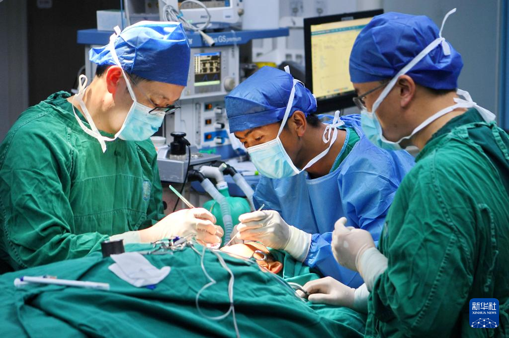 8月29日,王克明博士(左)和西藏自治區人民醫院醫生為患者實施手術。新華社記者 張汝鋒 攝