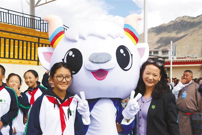 拉薩北京實驗中學學生與學校吉祥物“小京羚”合影留念。