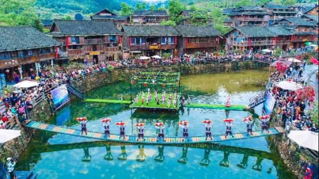 廣西投入中央財政少數民族發展資金1.6億元,打造民族村寨與鄉村旅游融合發展試點39個。圖為2024年4月廣西傳統民族節日“三月三”期間,來自全國的游客與夢嗚苗寨村民一起慶祝節日。廣西壯族自治區柳州市民宗委供圖