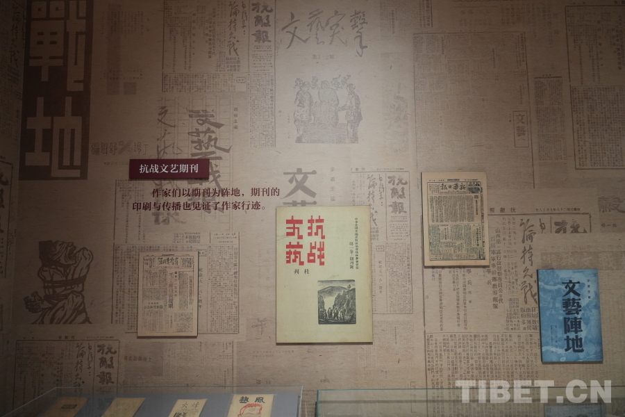 圖為中國現(xiàn)代文學(xué)館內(nèi),“山河跡憶——手稿里的抗戰(zhàn)中國”展覽中“文藝戰(zhàn)士”展示墻 攝影:郭睿佳