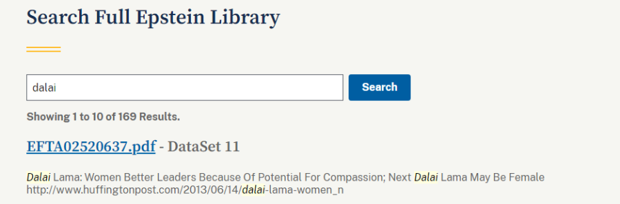 3月6日,比利時(shí)“歐盟記者網(wǎng)”報(bào)道,達(dá)賴?yán)镌趷蹪娝固褂嘘P(guān)文件中出現(xiàn)了169次。而據(jù)美國司法部官方網(wǎng)站最新查證,在愛潑斯坦案文件中,關(guān)鍵詞“dalai”仍出現(xiàn)169次,而“dalai lama”出現(xiàn)157次,“dali lama”出現(xiàn)61次。