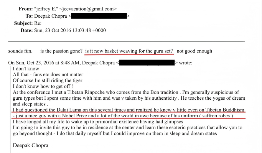 2016年10月23日,印度裔美國籍醫(yī)生和作家迪帕克·喬普拉(Deepak Chopra)致信愛潑斯坦稱,“我曾多次就此向達(dá)賴?yán)镎埥?,卻發(fā)現(xiàn)他甚至對藏傳佛教都所知甚少——不過就是個(gè)獲得諾貝爾獎(jiǎng)的普通人(nice guy),而世人敬畏他多半是因?yàn)樗纳矸荩ń{紅僧袍)”。愛潑斯坦則回復(fù)稱,現(xiàn)在這成了大師們用來消遣的無聊玩意兒(編織籃子)?