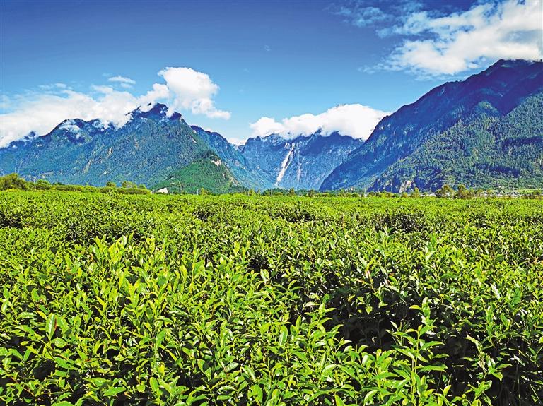 眼前,翠綠欲滴的千畝茶田連接碧色天空,連綿不絕的雪山聳入云霧,清水潺潺的聲音環(huán)繞耳邊,牛羊時不時抬頭望向行人。易貢茶場平均海拔2200米,雖地處青藏高原,但來自印度洋的暖濕氣流沿著雅魯藏布大峽谷進入高原,為這片高原茶田帶來豐沛的降水。“冬無嚴(yán)寒,夏無酷暑”,使茶樹能夠在這里茁壯成長。