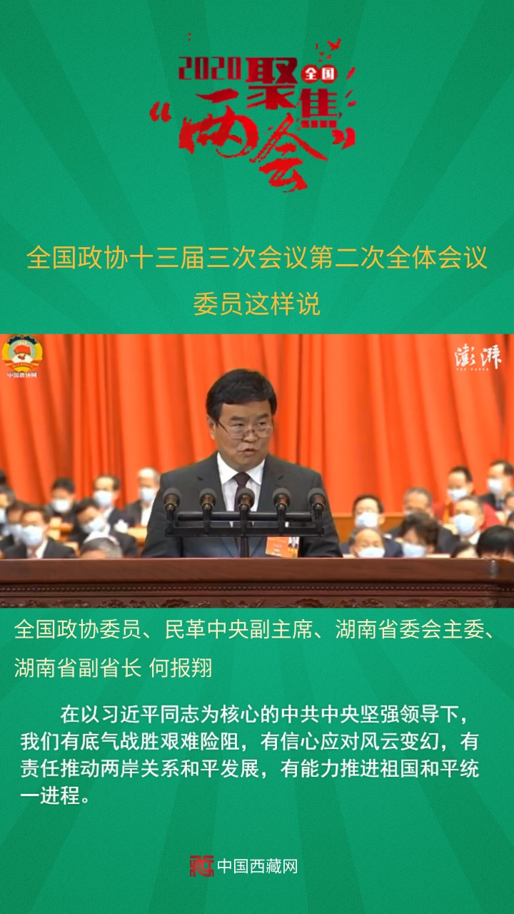 全國政協委員、民革中央副主席、湖南省委會主委、湖南省副省長何報翔發言說,在以習近平同志為核心的中共中央堅強領導下,我們有底氣戰勝艱難險阻,有信心應對風云變幻,有責任推動兩岸關系和平發展,有能力推進祖國和平統一進程。