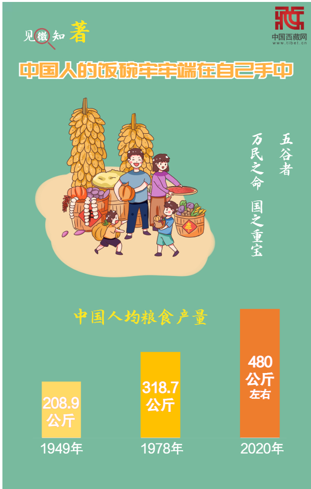 民以食為天。2020年,我國糧食又高位增產,供需總量基本平衡。中國人均糧食產量,從1949年的208.9公斤,到1978年的318.7公斤,再到2020年的480公斤左右,高于400公斤的國際糧食安全標準線。中國人的飯碗牢牢端在自己手中。(中國西藏網 制圖/楊月云)