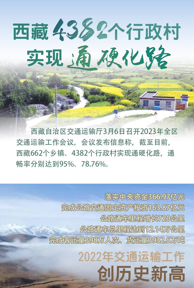 西藏自治區交通運輸廳3月6日召開2023年全區交通運輸工作會議,會議發布信息稱,截至目前,西藏662個鄉鎮、4382個行政村實現通硬化路,通暢率分別達到95%、78.76%。 [詳細] -