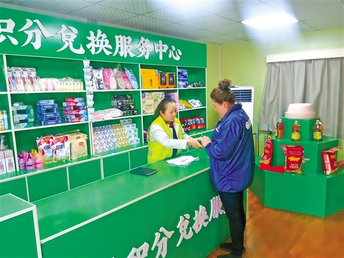 城關區嘎瑪貢桑街道辦事處統建社區居民在垃圾分類積分兌換超市兌換生活用品。