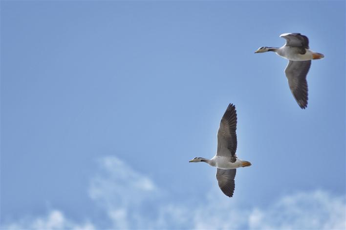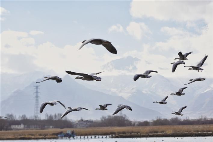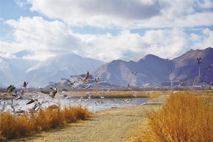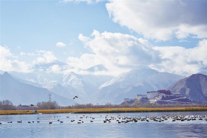 遠處,連綿起伏的山頂還覆蓋著薄薄的積雪,布達拉宮雄偉而秀美;近處,濕地內隨意顯現出的一塊塊水泊,成群的候鳥在水中玩耍嬉戲、在藍天白云下飛舞。見到可愛的飼養員帶來它們喜歡的麥粒,斑頭雁、紅隼、赤麻鴨、黃鴨等紛紛游上岸來,盡情地享受美食,發出歡快的叫聲。