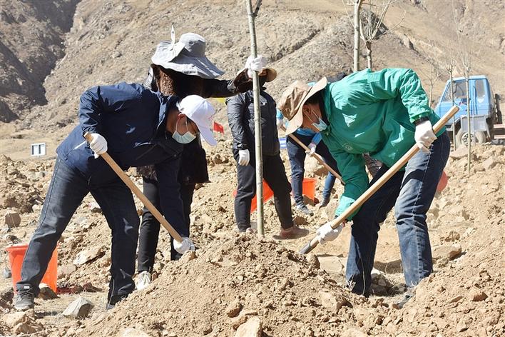 3月27日,區市142家單位的干部職工共同參加義務植樹活動,為拉薩大地再添新綠。圖為植樹現場,大家揮鍬鏟土、提桶澆水、搬運樹苗,栽下了一棵棵樹苗。拉薩融媒記者 旦 達攝