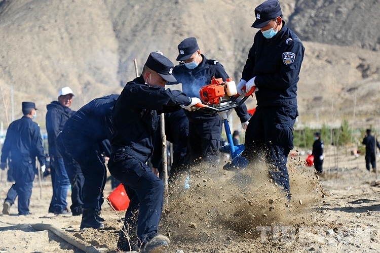 4月9日,民警們肩扛樹苗和鉆坑機,手持鐵鍬和水桶,再次來到雅魯藏布江畔的沙漠地帶,開展義務植樹公益活動。