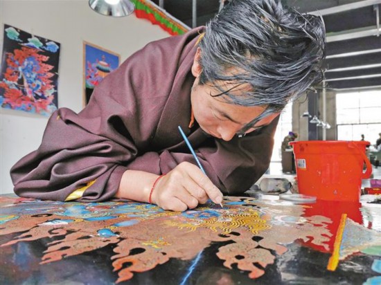 圖為唐卡漆畫技藝培訓班學員正在繪制唐卡。 鄭曉強、周婷婷 攝