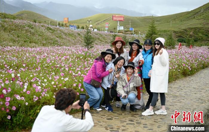9月9日,四川稻城縣金珠濕地公園一望無際的格桑花海姹紫嫣紅,過往車輛和游客們紛紛下車,走進(jìn)濕地公園用手機(jī)直播和拍照留念。