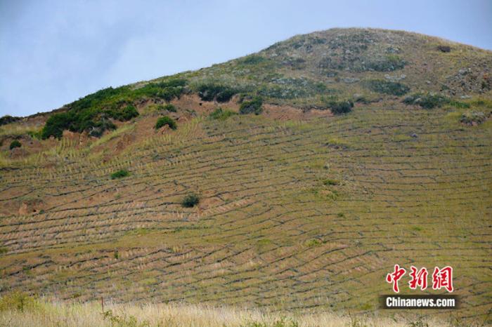 走進四川省阿壩州若爾蓋縣轄曼鎮西倉村治沙點,山坡上巨大的“棋盤”格外醒目。縣林草局生態修復股助理工程師涂勝介紹,這是用于治理草原沙化的高山柳沙障。